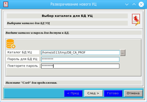 Создание УЦ начинается с выбора каталога, в котором будем хранить БД, и задания пароля для доступа к закрытому ключу УЦ. Нажав клавишу «След», мы переходим к странице выбора типа и параметров ключевой пары для УЦ: